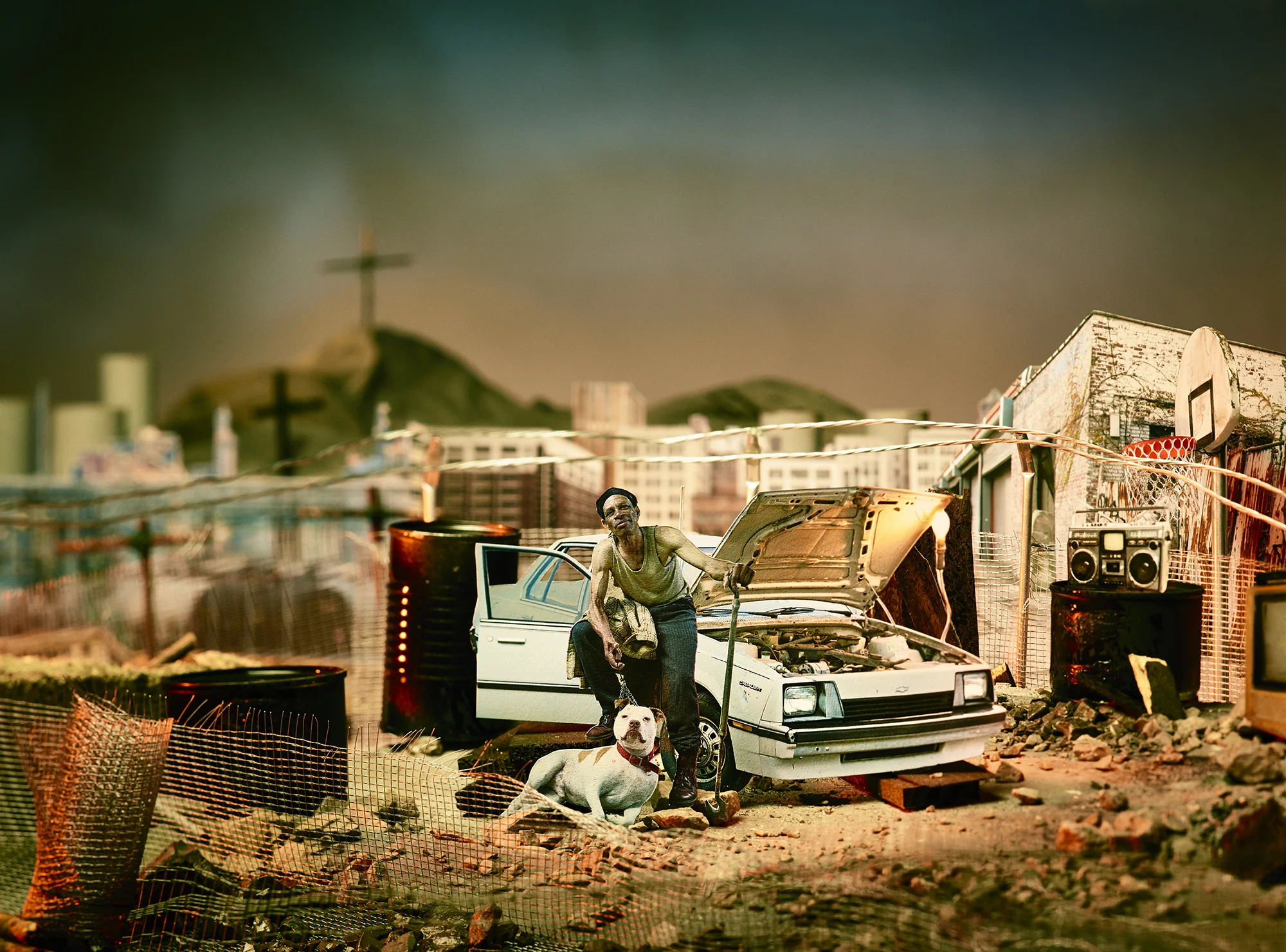 The final image is above. With great dignity, Gary and his dog 'Puck' stand out against a polluted urban landscape. Not sure of her behavior in the studio, he decided to leave the other dog, 'Lady', at home. I think that Puck did perfectly fine covering for her, however.